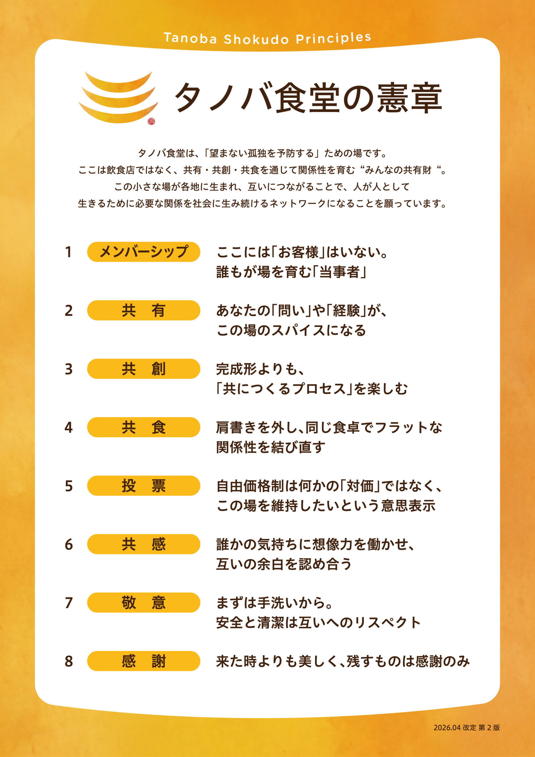あわせて、タノバ食堂の取り組みが次のフェーズへと進む中で、その思想やあり方をより明確にするため、「タノバ食堂憲章」の改訂を行っております。
